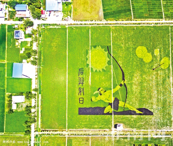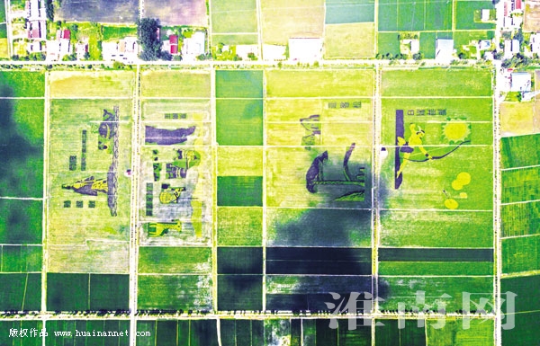 7月18日,空中航拍壽縣安豐塘第四年稻田畫初顯圖形。入夏以來,在壽縣安豐塘水庫北堤廣袤的田野上,一幅幅生動的立體“稻田畫卷”吸引著游人的目光。“后羿射日、迎客松、孫叔敖、淮南王”等畫面圖案的稻田畫,色彩艷麗、美輪美奐。據介紹,一幅“稻田畫”的種植大致要經過彩稻選育、圖案設計、定點測繪、人工栽種、田間管理等環節才能成畫,8月進入最佳觀賞期。