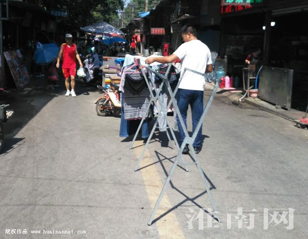 洞山基地美食街是一條步行街,每天居民買菜、買早點等都要經過此街。7月19日上午9時30分,淮河早報、淮南網記者途經這條街時,看見路中間被晾曬上了衣服。(記者)