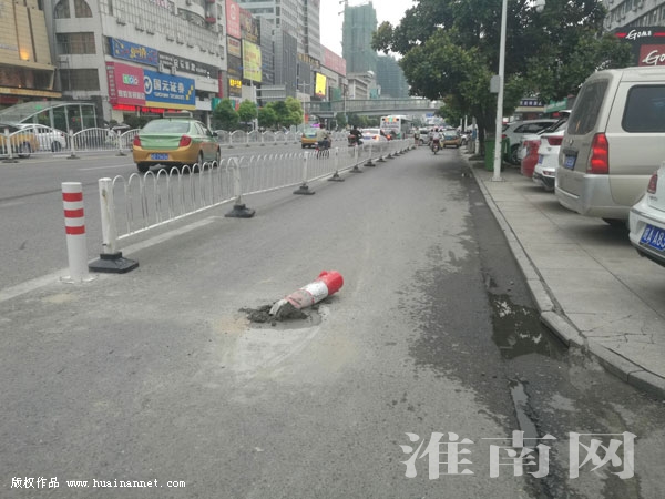 在朝陽中路北側商貿路段的非機動車道上,為防止機動車駛入或占道停放,相關部門在路面上設置了隔離樁。8月7日,淮河早報、淮南網記者經過朝陽中路北側國美電器附近時,看到非機動車道上有一個新安裝的隔離樁,底部水泥還未凝固就被碰倒了。(記者)