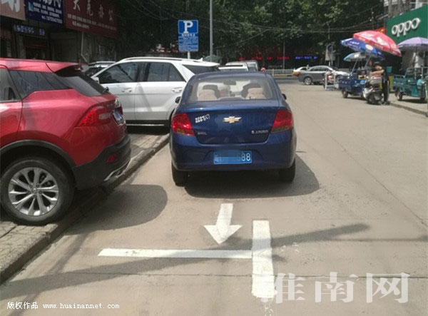 為規范車輛有序停放,相關部門在一些路段重新施劃了一批停車位,并標示出停放方向。不過一些車輛卻并沒有按照指示方向有序停放。圖為8月22日上午,在田區十六小南邊的一條道路上,一輛機動車逆向停放在停車位上。(記者)