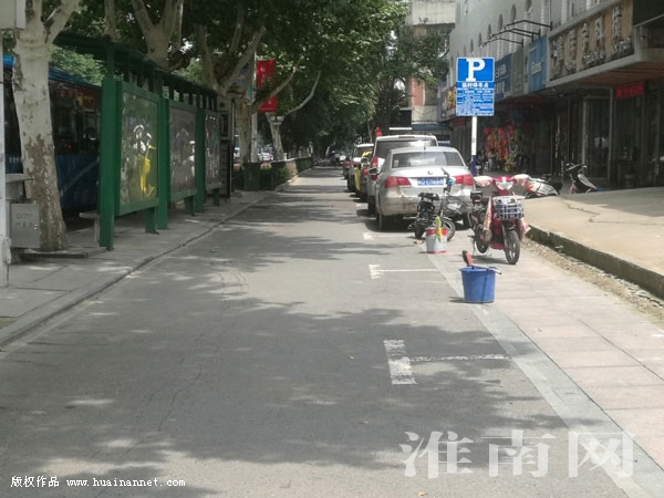 在淮河大道東側(cè)教院公交站后邊的非機(jī)動(dòng)車道上,為方便停車,相關(guān)部門施劃了一排停車位,不過一些停車位卻被人故意放置了一些桶、電動(dòng)車等,不讓機(jī)動(dòng)車停放。圖為兩個(gè)停車位上被放置兩個(gè)桶,并停放了一些電動(dòng)車。(記者)