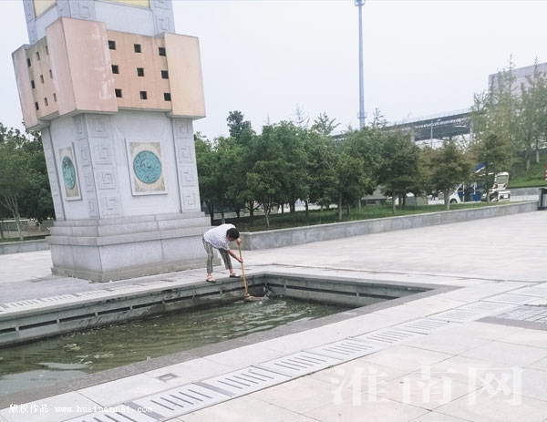 8月27日中午12時左右,淮河早報、淮南網記者在淮南高鐵東站站前廣場上看見,一中年婦女在廣場上的噴泉池內涮拖把,而毫不顧忌過往旅客投來的目光,直到將拖把涮干凈才離開。(記者)