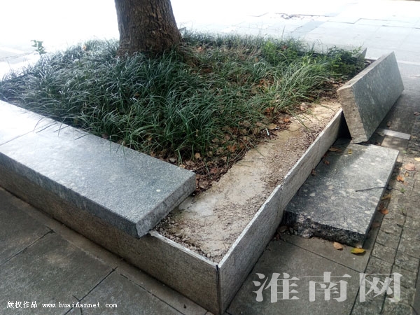 在尚錦廣場(chǎng),相關(guān)部門在一些大樹下用青石條圍繞著大樹修成了一個(gè)個(gè)方形坐凳,這些坐凳既可以讓市民在樹下小憩,又可以對(duì)大樹起到一定的保護(hù)作用。但近日,淮河早報(bào)、淮南網(wǎng)記者卻發(fā)現(xiàn),一些坐凳的青石條疑是被人敲掉,被破壞的青石條橫七豎八地扔在地上。(記者)