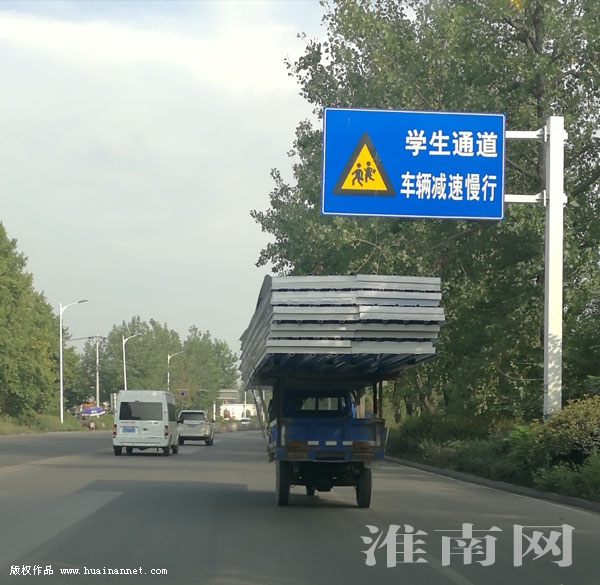 9月8日上午,在潘集區淮潘公路上淮河早報、淮南網記者看到一輛裝滿貨物的三輪車行駛在道路的中央。該車是一輛燃油三輪車,車長2米左右,車輛后廂所拉的貨物超出了車輛4米左右。因貨物超長,車主將貨物裝在了車廂的頂部。由于貨物超長超重該車在行駛的過程中歪歪倒倒過往的車輛都為三輪車主捏了一把汗。(記者)