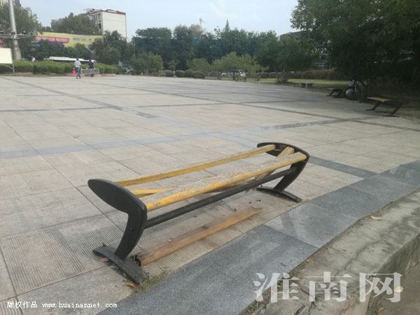 9月11日下午3時許,淮河早報、淮南網記者在淮河大道立交橋東側的一處廣場看到,廣場邊設置的一條供市民休息的長椅遭到破壞。(記者)