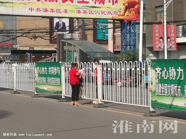 9月18日上午淮河早報、淮南網記者在潘集區黃山路上看到,一名家長帶著一個七八歲的孩子在馬路中央翻越護欄,女子已“成功”翻越,而孩子則在護欄的另一側,其伸出手臂,試圖將孩子抱起越過護欄。