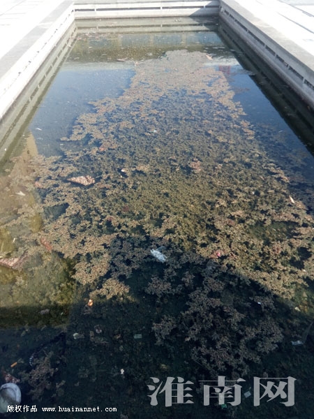 日前,有熱心旅客向淮河早報反映,位于淮南高鐵東站廣場上的幾個景觀水池里的水質比較臟,池水內除了淤積大量的綠苔外,水面上還漂浮著一些煙蒂、廢紙、食品袋等雜物。(記者)