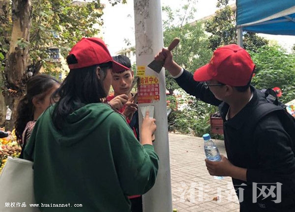 連日來,來自市公路局石料廠和淮南師范學院金融與數學學院的黨員志愿者們走進龍泉街道南嶺社區,清理路邊和居民區內存在的“牛皮癬”小廣告等,以實際行動積極參與和支持全國文明城市創建工作。圖為黨員志愿者們在清理亂張貼的小廣告。(記者 張明星 編輯 湯寧)
