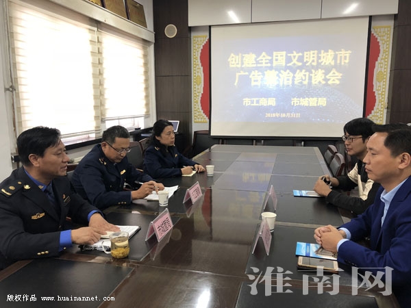 “你們的這種行為違反了《淮南市城市市容和環境衛生管理條例》等條例。”“廣告內容應該真實、合法、健康……”10月31日下午,市城市管理行政執法局和市工商行政管理局的相關負責人分別向約談的朝陽房產公司和大眾門業的負責人宣傳相關法律法規。