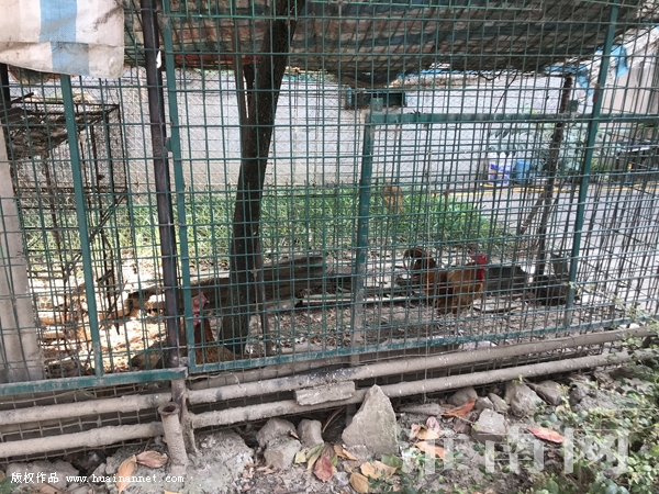 順著小區的主干道繼續走下去,除了小片的綠地被開墾成菜園外,還有一些自行搭建的簡易棚,幾戶居民家門口都有這種簡易棚,棚子里擺放的都是一些桶、家具、木材等雜物。而在另幾幢樓前,淮河早報、淮南網記者看到了兩戶門前用鐵網拉成的柵欄墻,柵欄墻里是幾只雞在來回踱步,時不時低頭找食吃。