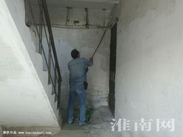 在1號樓一單元,淮河早報、淮南網記者看到,專業工人在用鏟子鏟除紙質小廣告后,從四層往下,一層一層噴涂乳膠漆。“小廣告太多了,有的顏色還比較深,用一般的涂料根本覆蓋不住。”一名工人師傅介紹,用乳膠漆效果會好些,可以把小廣告全部覆蓋住。