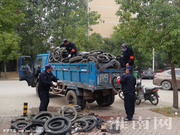 10月31日,大通區組織城市文明勸導員對城區主次道路兩側、小區周邊道路亂堆亂放的雜物進行集中清理,有效凈化了城區環境。圖為城市文明勸導員在清理廢棄輪胎。(記者 朱慶磊 編輯 湯寧)