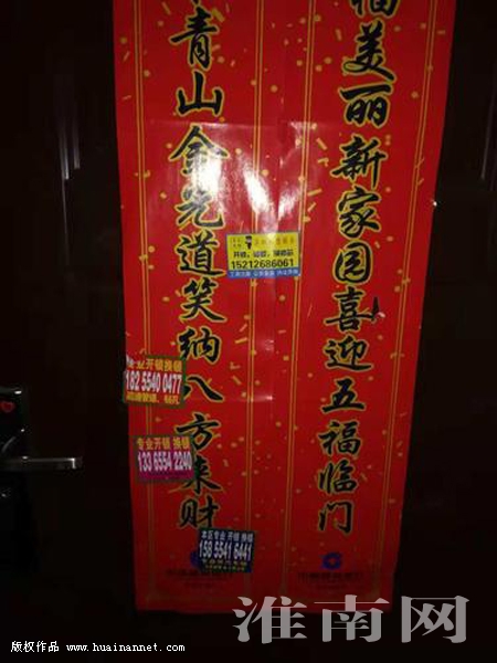 最近,創城工作已深入人心,許多貼在墻上的小廣告都被鏟除,可這些貼小廣告的人并沒有撒手,竟把小廣告貼在了市民家門上或是大門對聯上,影響美觀不說,還特別不容易去除。圖為青水灣小區一戶居民家對聯上被貼上小廣告。(記者)