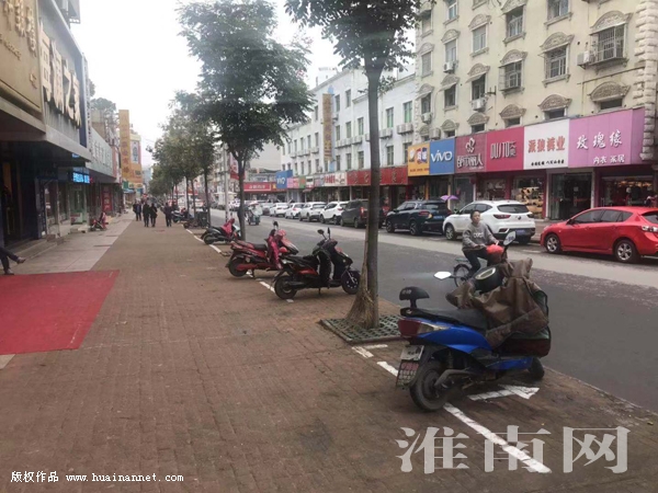 11月15日上午9時許,本網創城報道組記者來到了八公山區商業街,看到整條道路井然有序,地面標線十分醒目,機動車及非機動車都整齊有序地停放在各自施劃的停車區域,整條道路十分通暢。