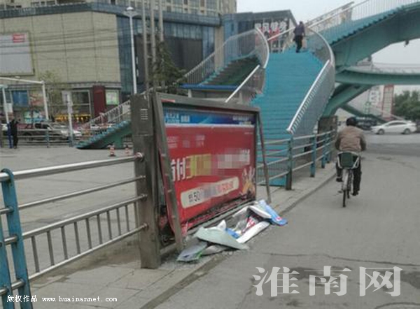 11月15日下午,淮河早報、淮南網記者在龍湖路人行天橋旁看到,有一處廣告櫥窗破壞嚴重(如圖),玻璃碎落一地。由于處在十字路口旁,十分影響市容環境,希望相關單位看到后能及時修復。(記者)