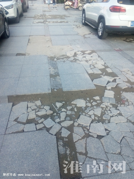家住黎明樓小區的劉先生向淮河早報、淮南網記者反映,在他居住的小區北面有近200米長的大理石人行道,近年來出現嚴重的破損現象。劉先生說,大理石路面之所以出現破損現象,主要原因是機動車碾壓造成的。遇到雨雪天,破損的路面就會積滿污水,令行人苦不堪言。(記者)