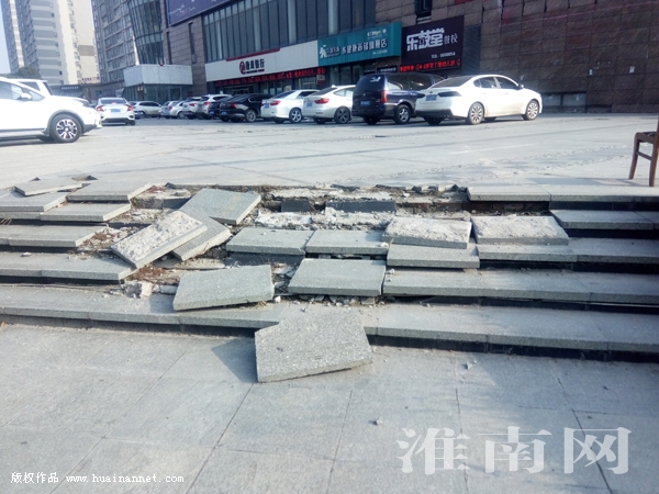 11月25日,市民楊先生向淮河早報、淮南網熱線反映,在尚錦廣場西出口處,有兩條大理石鋪成的行人階梯通道。讓人痛心的是,這兩條階梯上的大理石臺面遭到嚴重破壞,一些大理石條已支離破碎,散落在臺階上。(記者)
