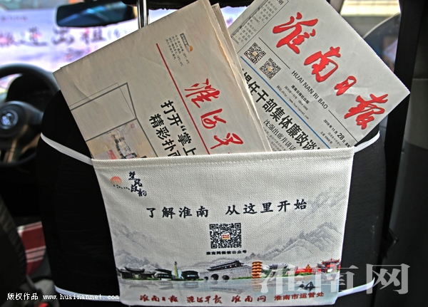 “了解淮南,從這里開始!”打開出租車右后門,系在副駕駛座椅后背的閱報布袋映入眼簾,由淮南日報社設計制作的閱報袋充分結合了淮河、八公山、壽縣古城等淮南特色文化元素,既簡潔美觀,又與座椅結合相得益彰。今后,淮南日報社將安排投遞人員每天循環不間斷地把《淮南日報》《淮河早報》投放到出租車上,乘客可以在乘坐出租車時閱讀黨報,并提倡帶走閱讀。