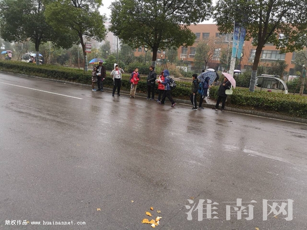 隨后,淮河早報、淮南網記者又來到潤水路、民惠街,發現這里小區眾多,可有的車站只有一根光禿禿站牌,沒有一點可供市民遮陽擋雨的站立之處。在和悅東街、杜鵑路、民裕大街上,淮河早報、淮南網記者看到,這3條道路周邊不僅有兩所學校,還有多個住宅小區,可車站的設置仍是非常簡陋,基本上都是直接在綠化帶中豎一根站牌。采訪中,天空下起中雨,不少放學的學生打著雨傘來車站候車,可由于沒有站臺,不少學生只得冒雨站在一旁的慢車道上等車。