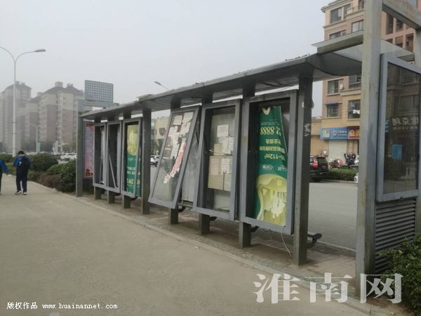 在泉山湖洞山中學公交站,站臺候車亭廣告箱體破損嚴重,有的不能正常關閉,有的箱體玻璃缺失,還有亂貼小廣告現象,整個候車亭廣告箱體顯得凌亂不堪。(記者)