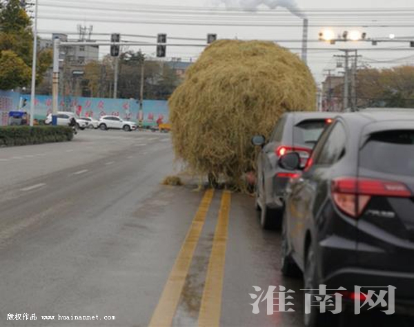 近日,淮河早報、淮南網記者在國慶中路與田大南路交匯處看到,一輛滿載干草的三輪車正在搖搖晃晃前行,由于負重太多,堆在上面的稻草也沒有很好地固定住,以至于邊行駛邊往下掉,駛過的路面上都是一小堆一小堆的干草,影響了道路整潔。(記者)