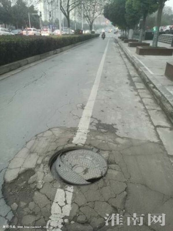 在朝陽路與廣場路交叉路口西邊北側的非機動車道上,有一處窨井蓋破損斷裂,靠防墜網兜著,存在安全隱患。(記者)