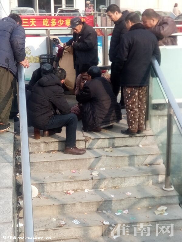 日前,淮河早報、淮南網記者在朝陽中路南邊一小廣場上看到,一群打牌和看牌的市民在娛樂時,將煙蒂、煙盒、瓜子殼等垃圾隨手扔在人行道上,這種不文明行為,有損城市形象。(記者)